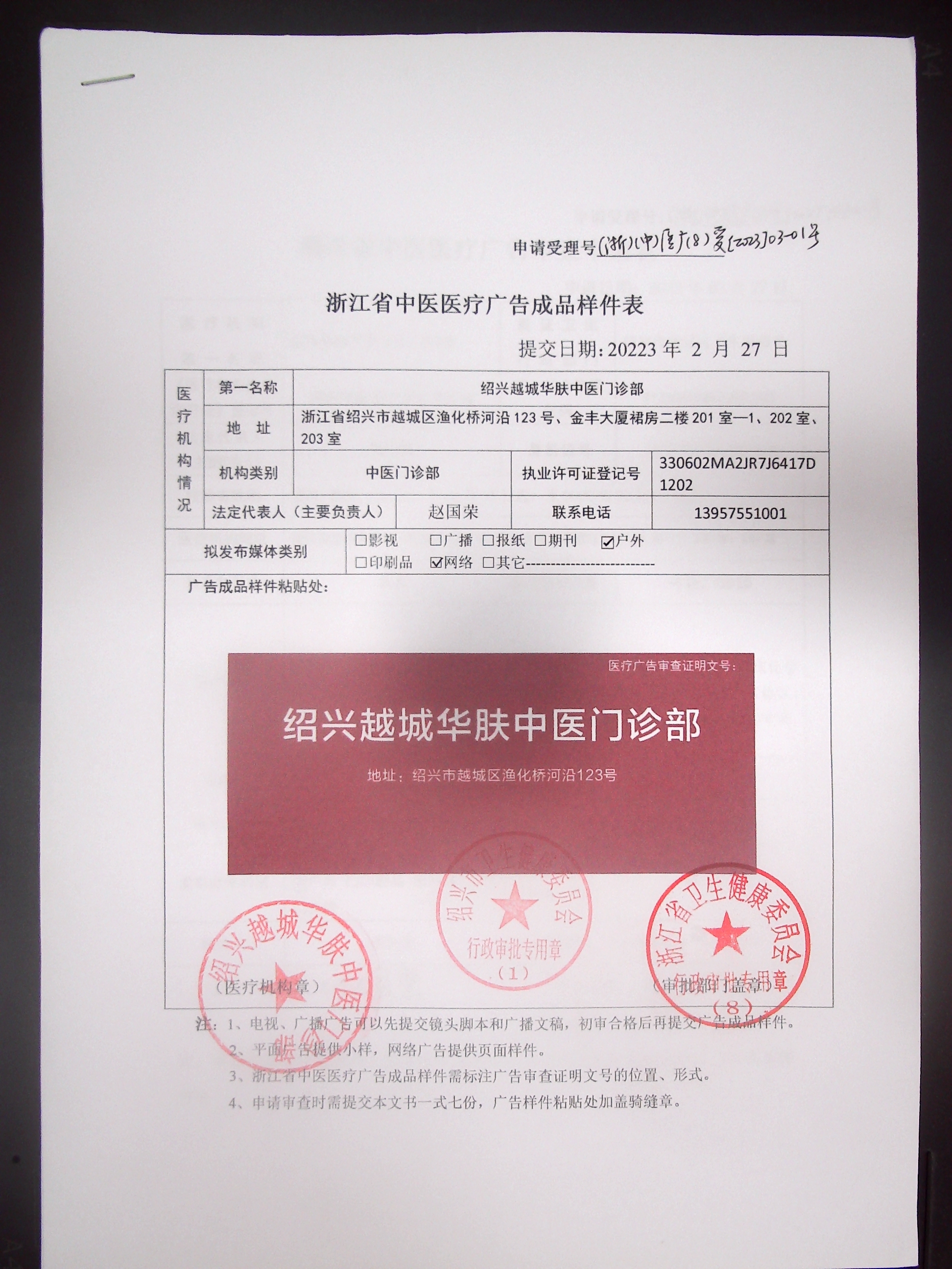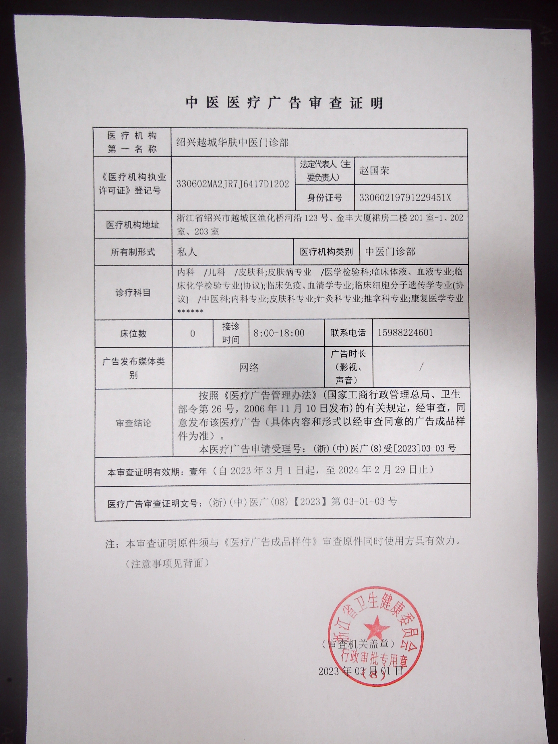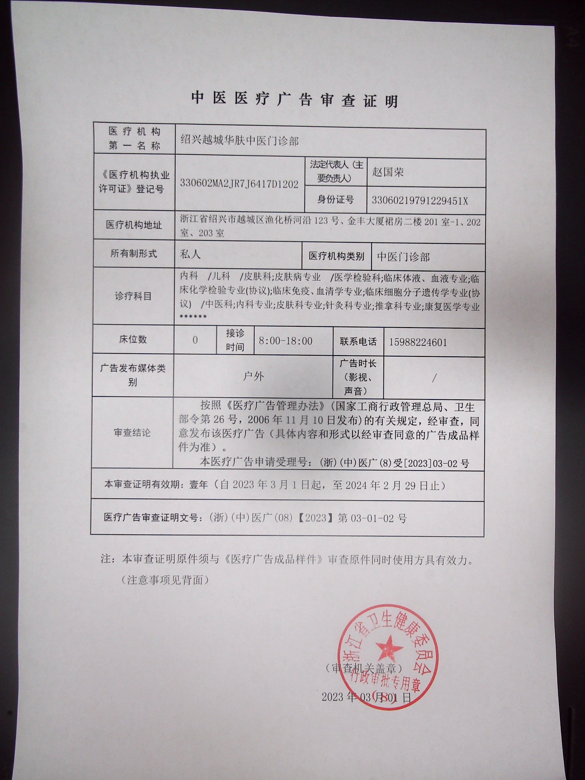 医疗广告审查证明(绍兴越城华肤中医门诊)